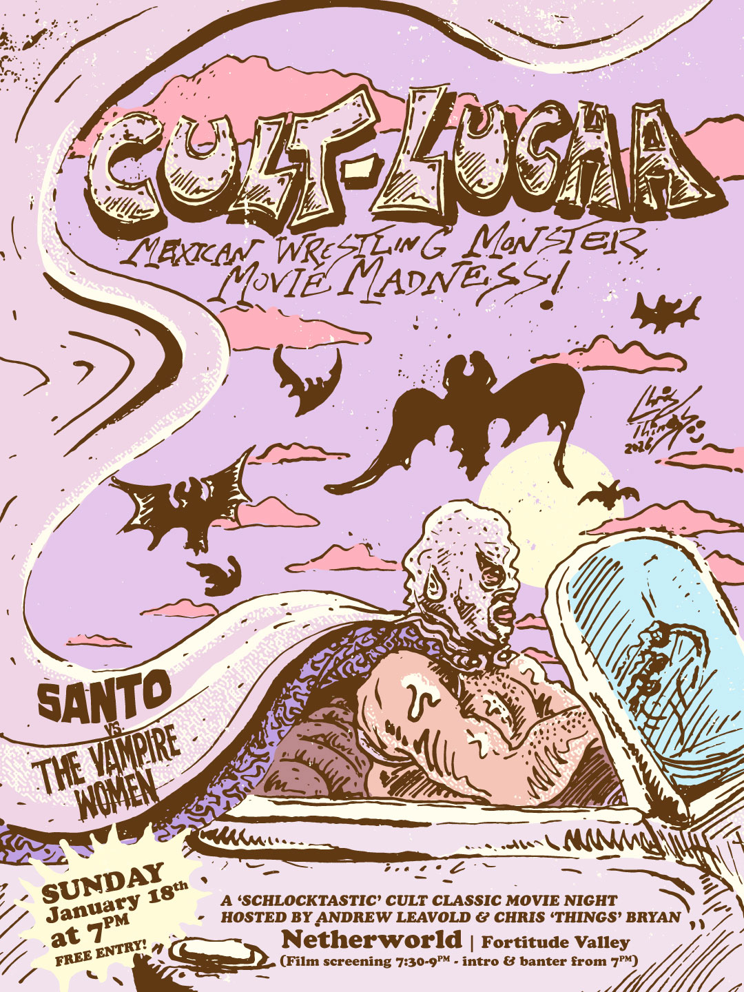 Join us for a new event for 2026 – CULT-LUCHA: Mexican Wrestling Monster Movie Madness! A monthly Sunday movie night in the Netherworld hosted by Brisbane Schlock-Film luminary Andrew Leavold (Trash Video) and local Lucha Libre artist and wrestling fanatic Chris Bryan.
