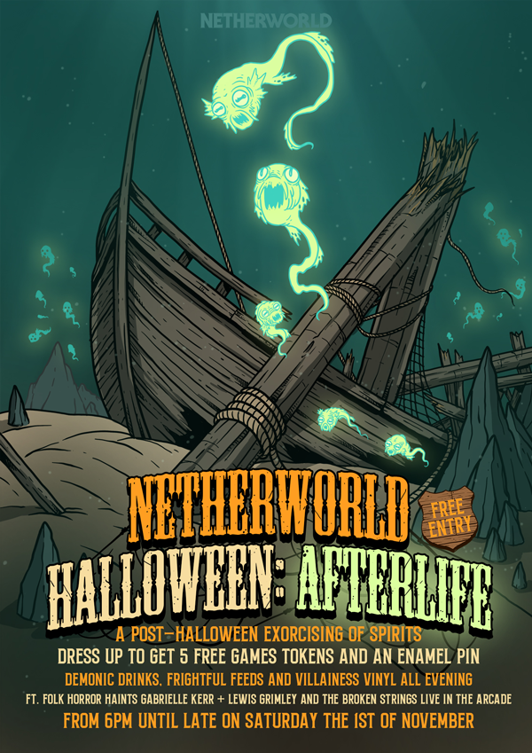 We’ll be dressed up on the evening and we want to see you dressed up too – so much so that anyone that arrives in costume will get 5 free Netherworld gaming tokens and a Halloween enamel pin. We’ll also be spinning the monster mash and its freaky vinyl friends all evening, whilst we’ll have devilish drinks and terrifying treats from the Hellmouth Diner.