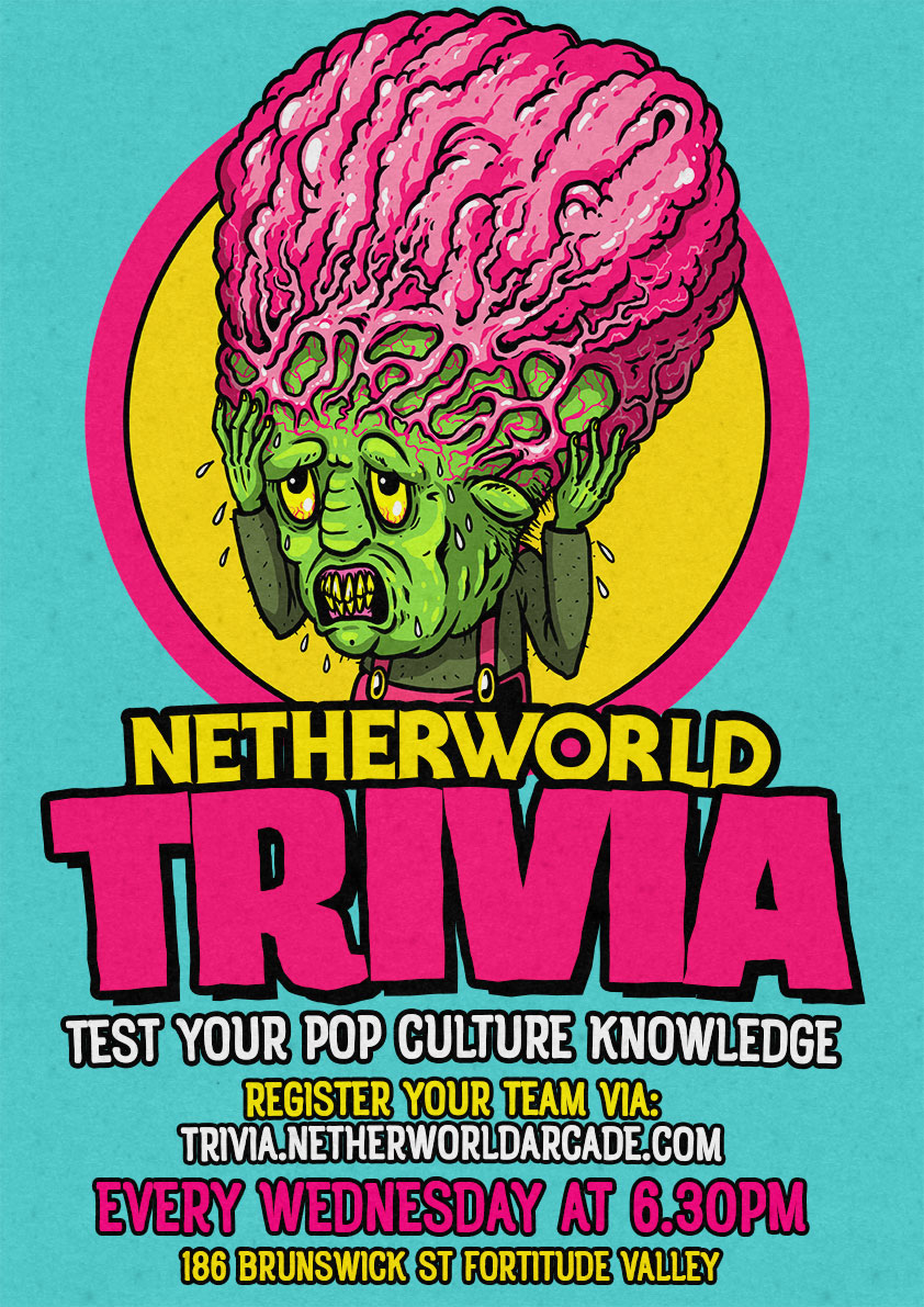 Netherworld’s weekly Trivia! Focusing on general pop culture, you’ve got to be current and not-so-current on your movie, television, games and weird event knowledge. Prizes for the top 3 teams and enamel pins for the winning team! It happens every Wednesday in the Netherworld at 6.30pm sharp. Registration is necessary and tables are seated on a first in best dressed basis.