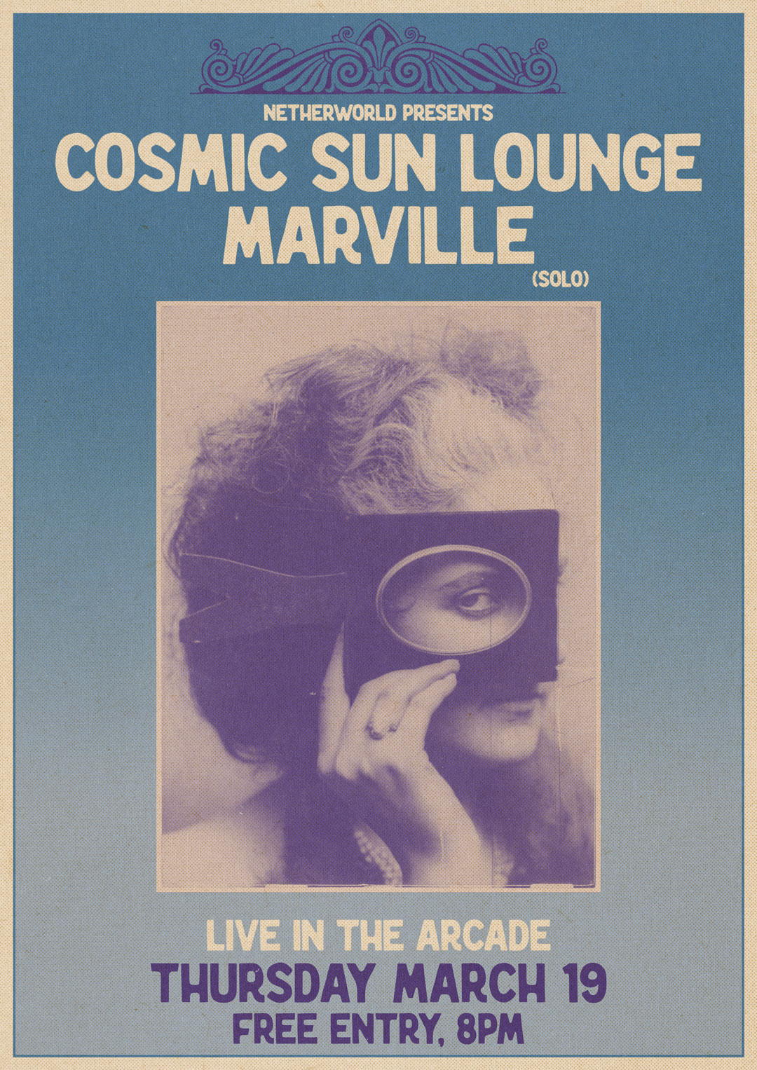 Cosmic Sun Lounge + Marville (solo) – Live in the Arcade Mar 19 Cosmic Sun Lounge + Marville (solo) – Live in the Arcade 8:00 pm - 10:30 pm